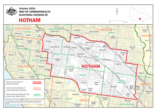 NEW The Australian Electoral Commission has finalised the new boundaries for Hotham (below). This means that, at the next election, we’ll sadly say goodbye to some constituents, while also welcoming others – and saying hello again to some familiar faces. Learn more at the AEC website.